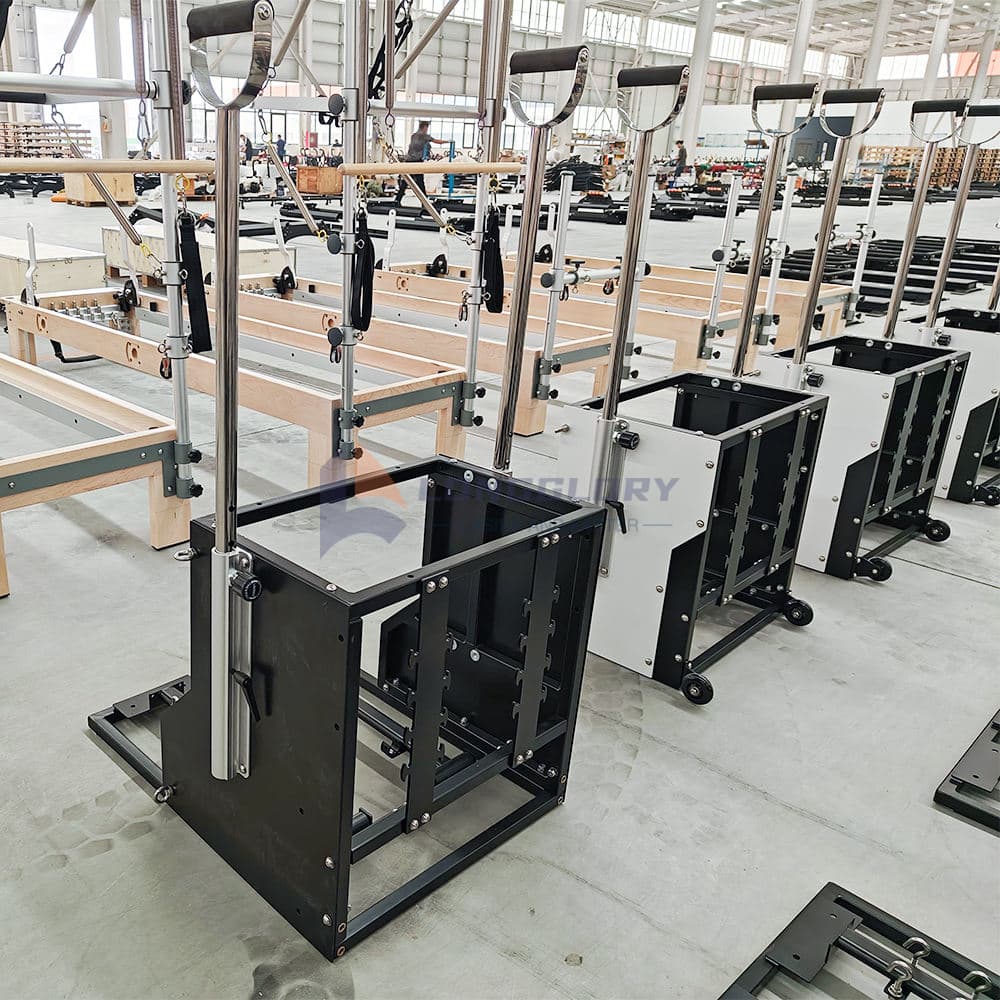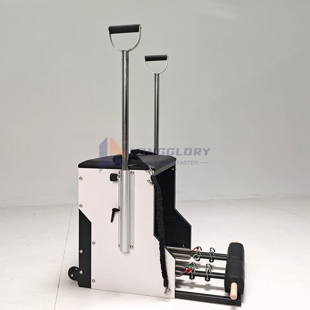 Вунда столица има подесиве педале и опруге, омогућавајући корисницима да прилагоде отпор за вежбе усмерене на трбушњаке, леђа, глутеусе и ноге. Његов ергономски дизајн са неклизајућим јастучићима за стопала и јастучићима високе густине осигуравају сигурност и удобност током тренинга. Идеалан за ентузијасте пилатеса, фитнес студије, теретане и рехабилитационе центре, подржава равнотежу, поравнање кичме, корекцију држања и снагу целог тела.